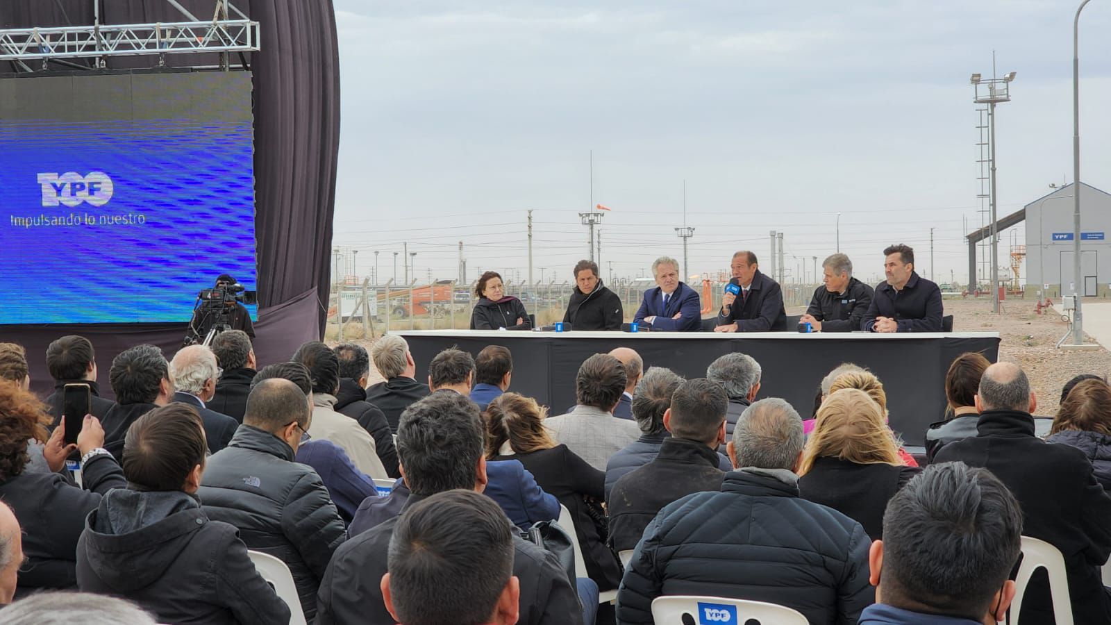 Alberto Fernández, junto al gobernador neuquino, Omar Gutiérrez, el bonaerense, Axel Kicillof, y el titular de YPF, Pablo González, en otro de los actos en torno de la obra
